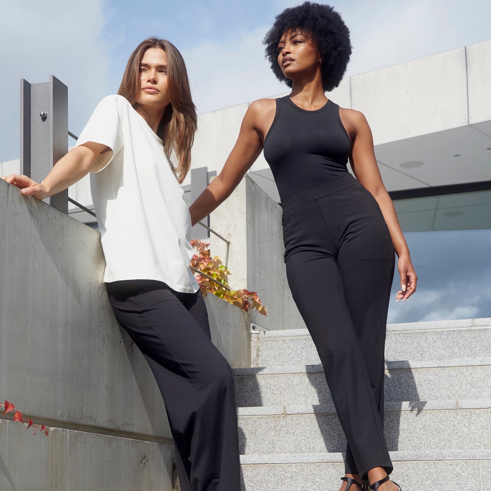 Two women wearing Ninepine office trousers styled for work—one in a light turtleneck with dark trousers, the other in a blazer with black tailored trousers—posed against a concrete wall.