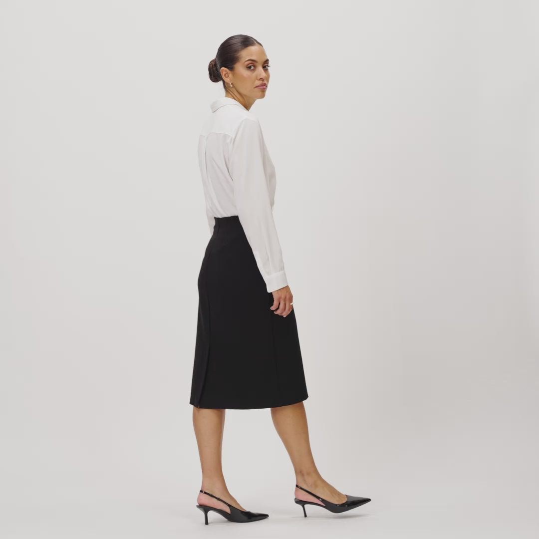 Our midi skirt combines sophistication and comfort, made from luxurious double-knit ponte fabric with a high waist, hidden elastic waistband, and a back slit for ease.